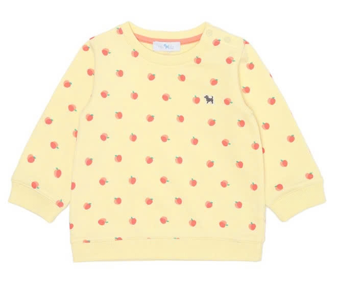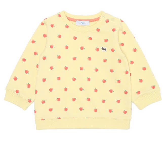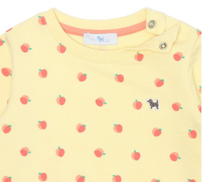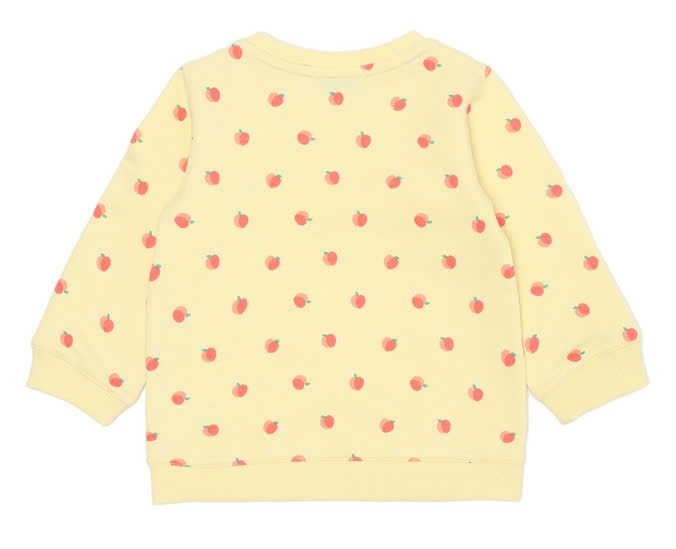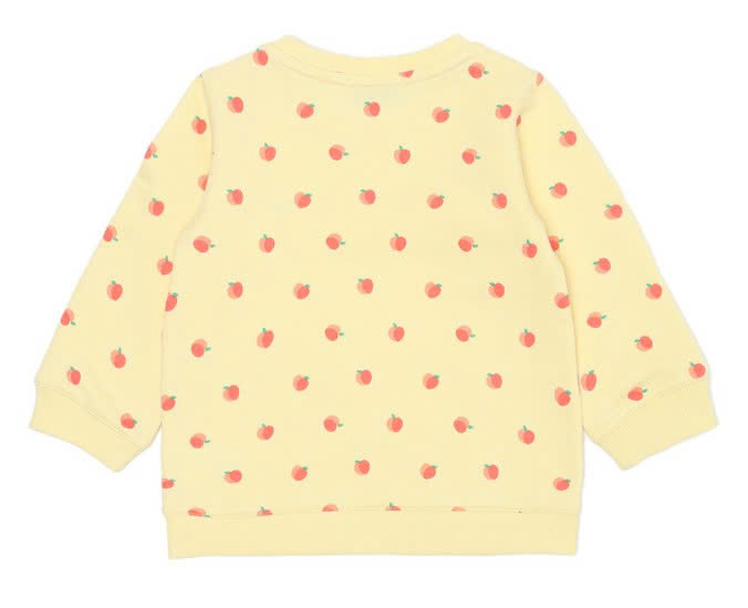 Áo chất liệu nỉ da cá mềm thân thiện với da em bé. Áo họa tiết táo trên nền vàng đáng yêu. Áo rất dễ mix đồ, bé diện đi học và đi chơi đều rất tiện.