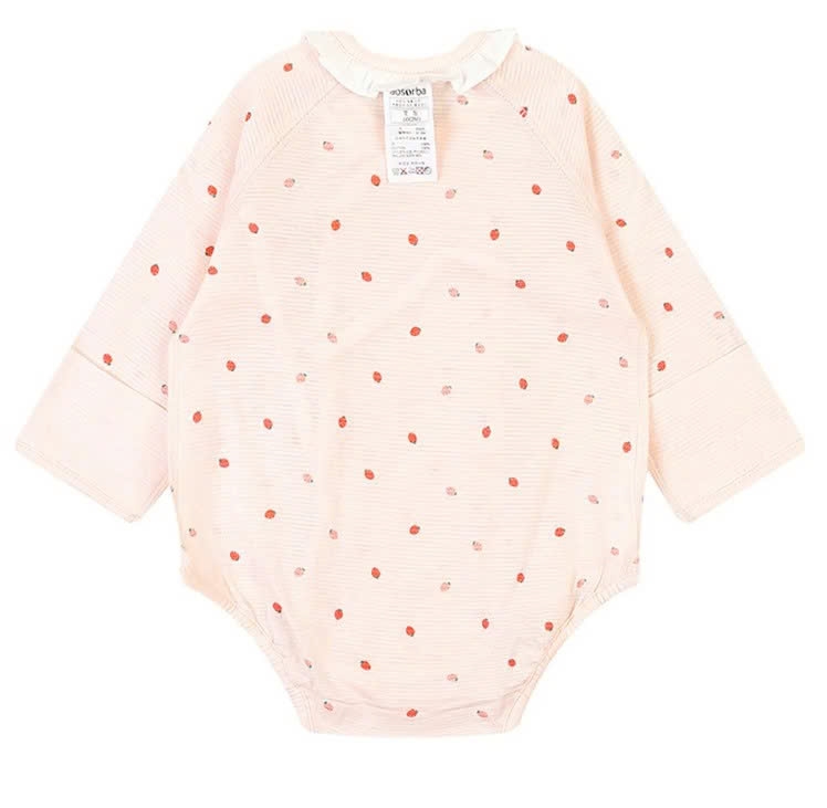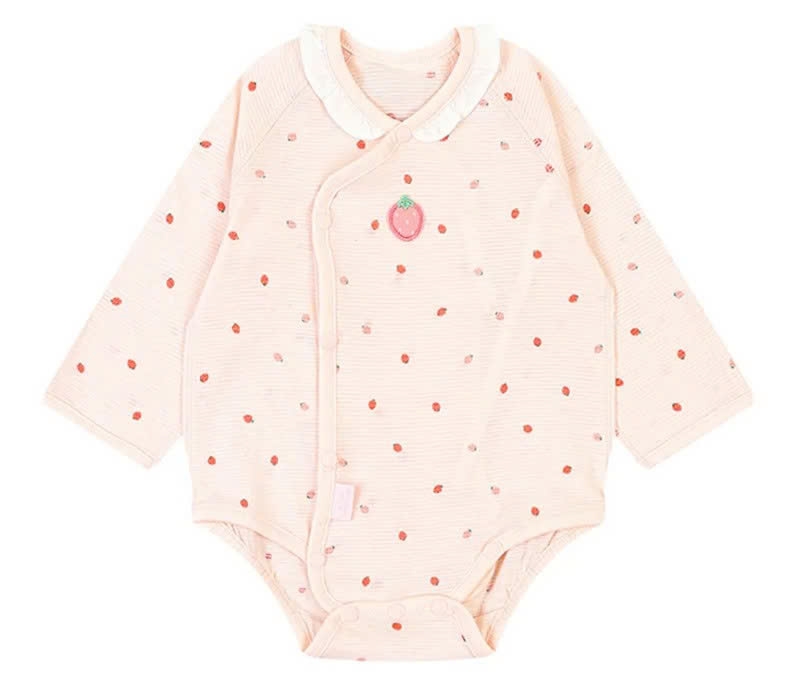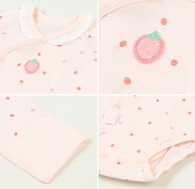 Body chất liệu cotton giấy thoáng khí, họa tiết dâu tây dễ thương cùng cổ bèo đáng yêu. Thiết kế dành riêng cho các bé 0-3 tháng tuổi cùng dây buộc phía trong dễ mặc cho bé, đường may chập lộn trái tỉ mỉ để không làm kích ứng da non nớt của bé.