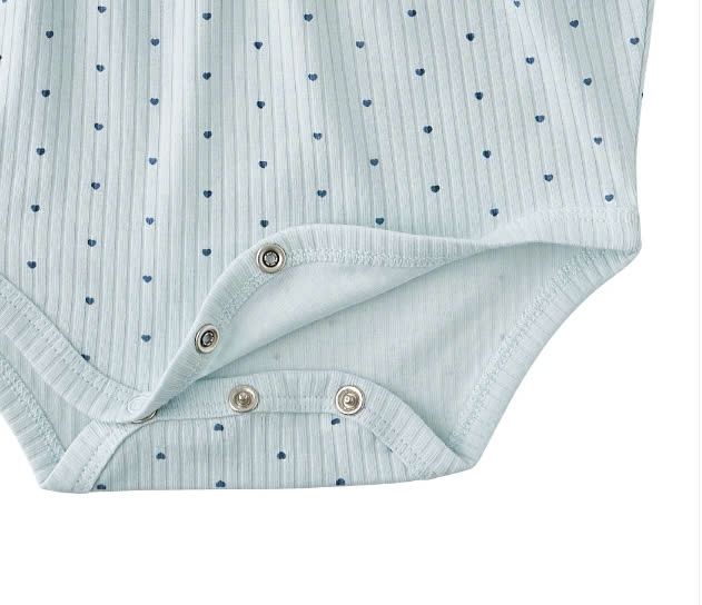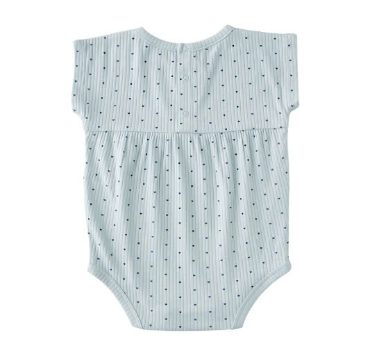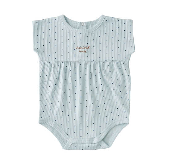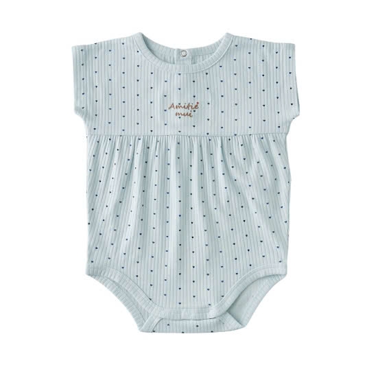 Body với chất liệu thun mềm mát thân thiện với da bé. Thiết kế body tam giác mát mẻ vào mùa hè nhưng vẫn đủ giữ ấm bụng cho bé. Họa tiết bi tim nền xanh pastel ưa nhìn dễ thương.